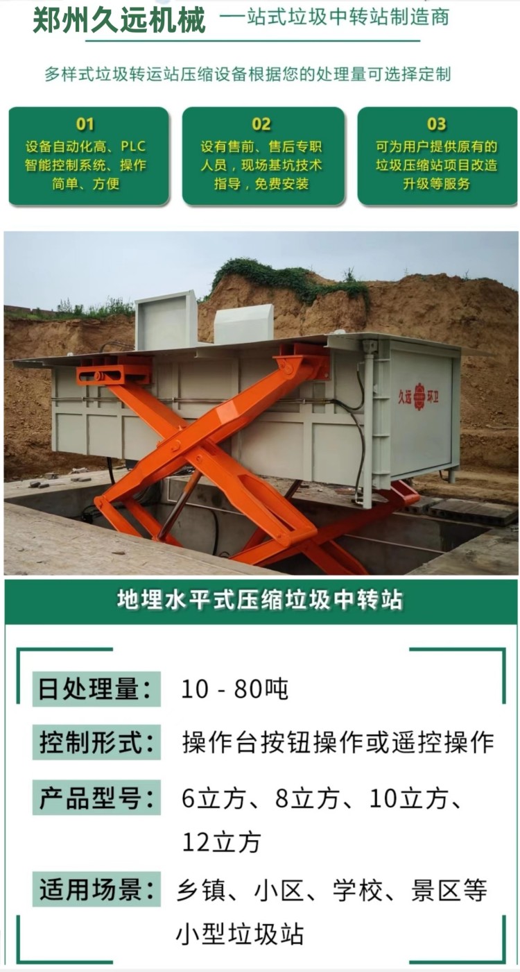 水平式生活垃圾壓縮中轉(zhuǎn)設(shè)備是將垃圾的卸(出)料、壓縮、儲存集合在一起,整體落于地下,利用地下空間將垃圾密閉在箱體內(nèi),地面上無垃圾外露現(xiàn)象,壓縮垃圾產(chǎn)生的污水經(jīng)排污管道直接流入污水井內(nèi),然后由污水泵排到城市污水管網(wǎng),徹底解決了垃圾在收集、儲存、裝運過程中的污染環(huán)境、作業(yè)效率低等問題。