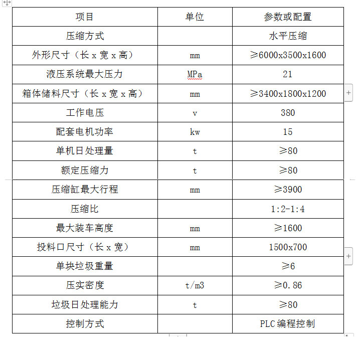 ◇全封閉水平壓縮:采用水平壓縮方式,垃圾壓縮密度≥0.86t/m3,垃圾壓縮后體積大大減小,從而大幅度提高轉運車輛裝載量和轉運效率,降低垃圾處理、轉運等費用;